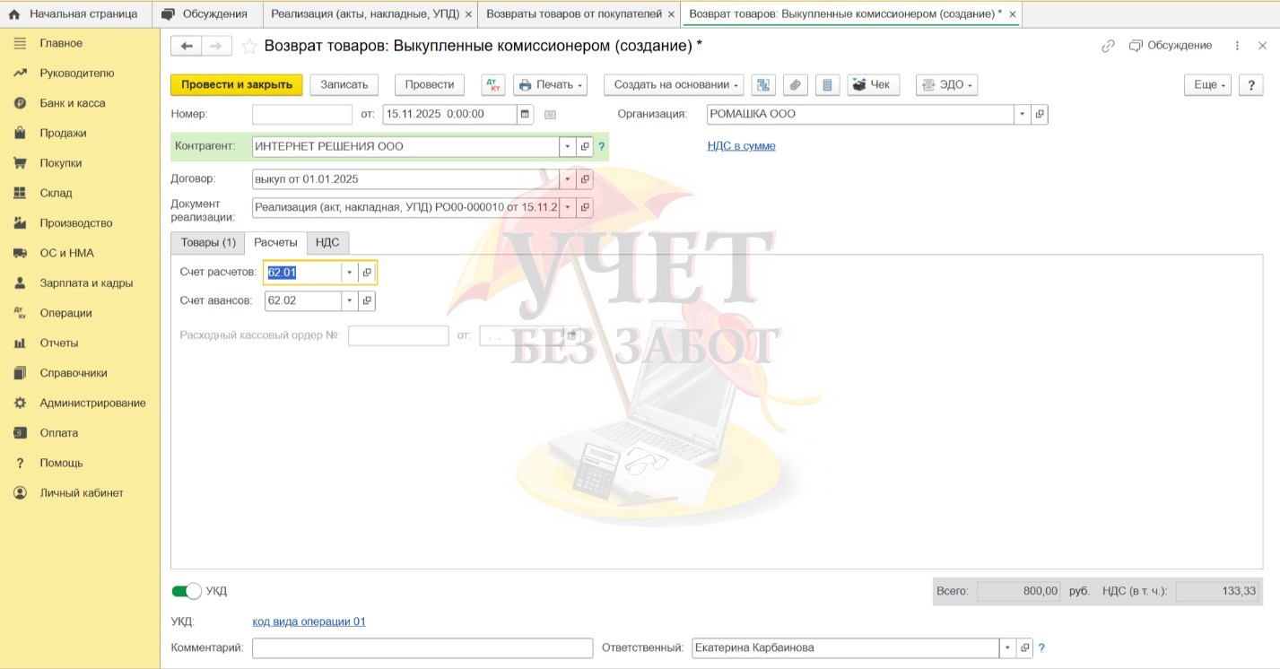 В нашем случае возвраты за период с 01.11.2025 по 15.11.2025, поэтому возврат мы проводим 15.11.2025. Контрагент - Интернет решения, договор - тот же, по которому проведена реализация. Документ реализации – в нашем случае это выкуп от 15.11.2025.
