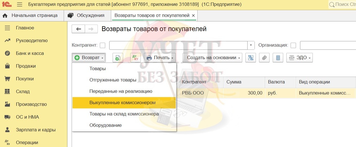 Заходим в раздел «Продажи», далее «Возвраты от покупателей». Нажимаем «Возврат» и выбираем «Выкупленные комиссионером»: