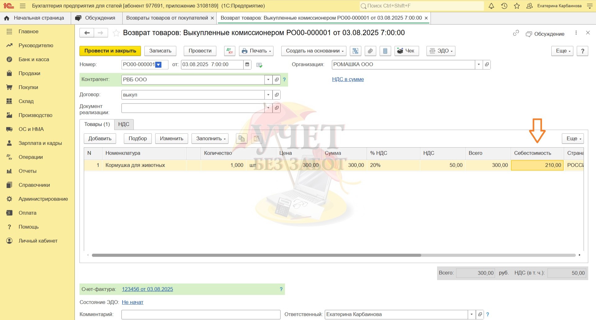 Если вы затрудняетесь определить, из какой реализации был возврат, то можете это поле не заполнять, но тогда в табличной части вам придется заполнить графу «Себестоимость».