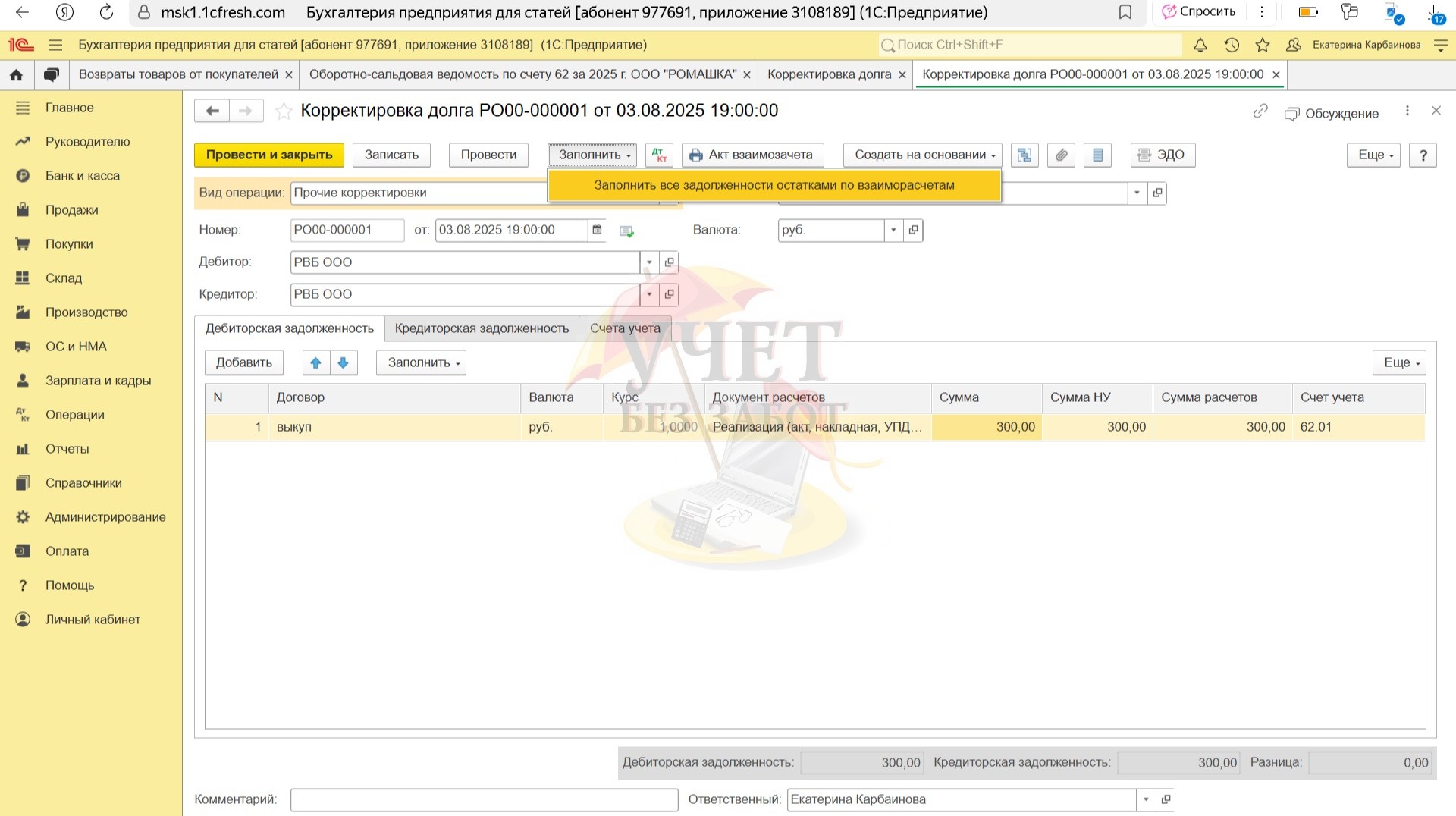 Поступление товаров проходит по 60 счету. Чтобы уменьшить задолженность по выкупу на 62 счете, нужно провести взаимозачет корректировкой долга. В дебиторской задолженности будет реализация (выкуп), а в кредиторской – поступление товаров (возврат).