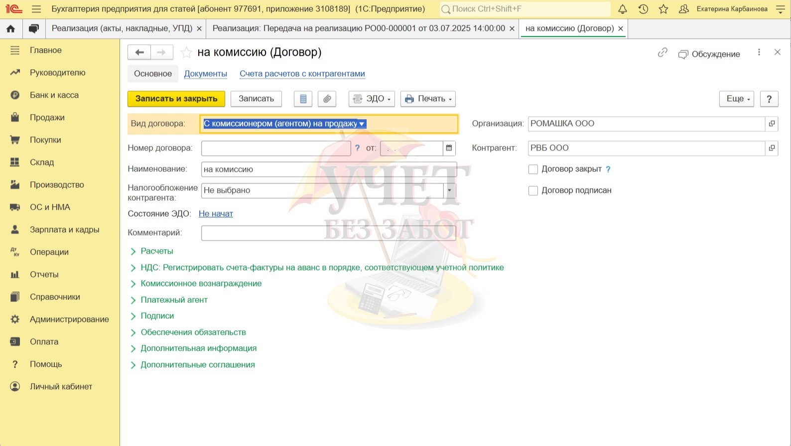 Передачу товара нужно проводить по договору комиссии, оформленному в 1С с видом «С комиссионером (агентом) на продажу».
