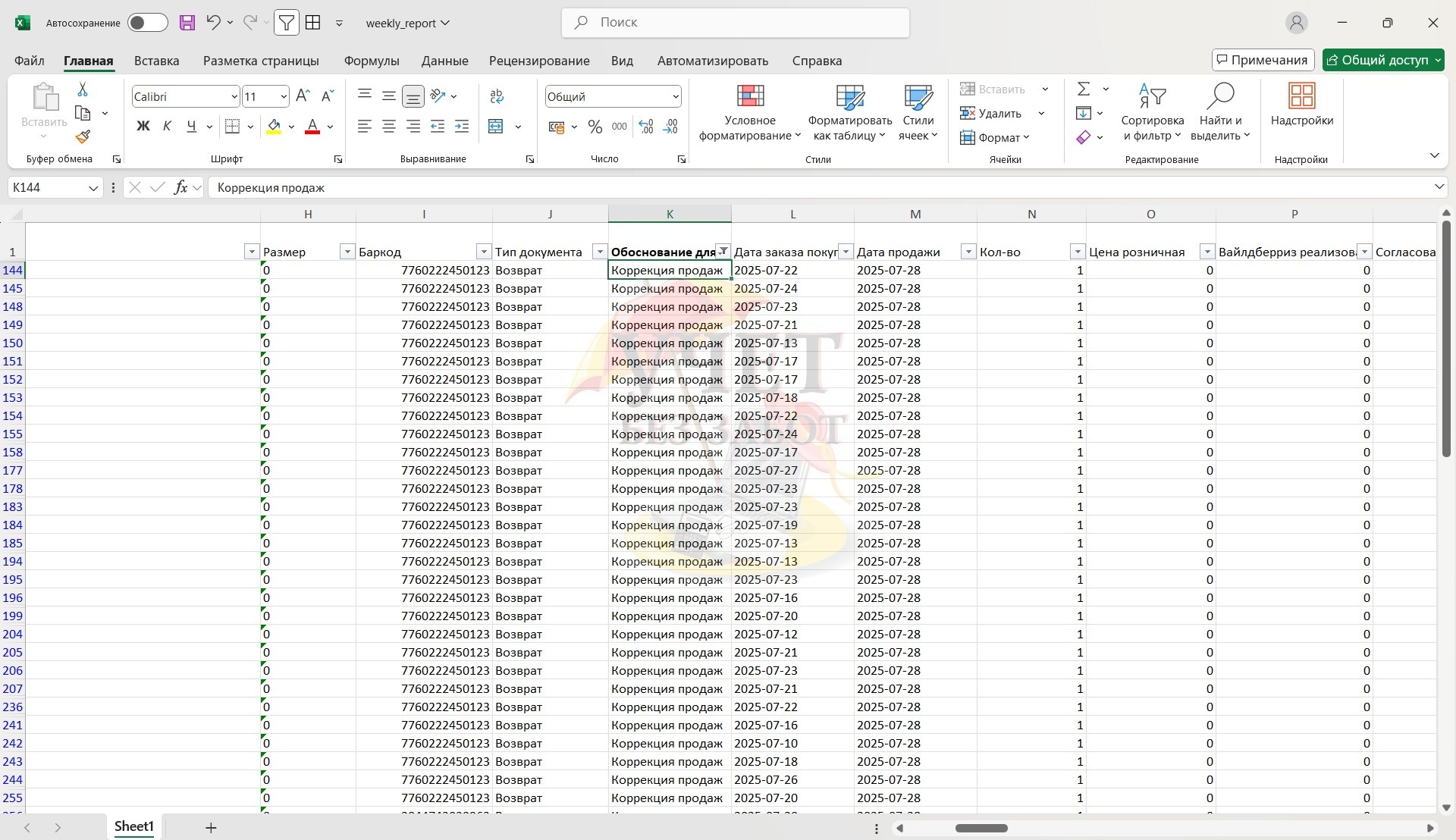 Но РВБ не перестает нас радовать своими изменениями. В августе 2025 года они добавили новшество в детализации, а именно в столбце «Обоснование для оплаты» добавили значение «Коррекция продаж» (тип документа «Возврат»).