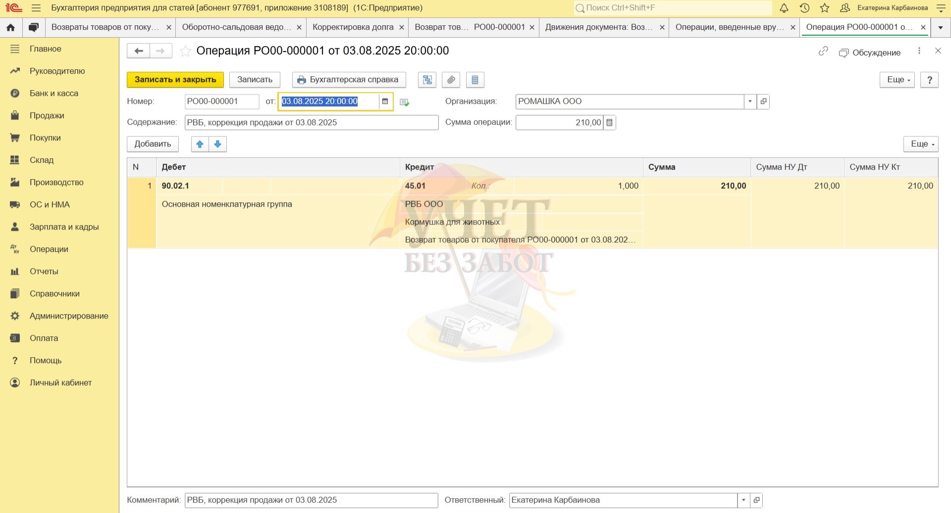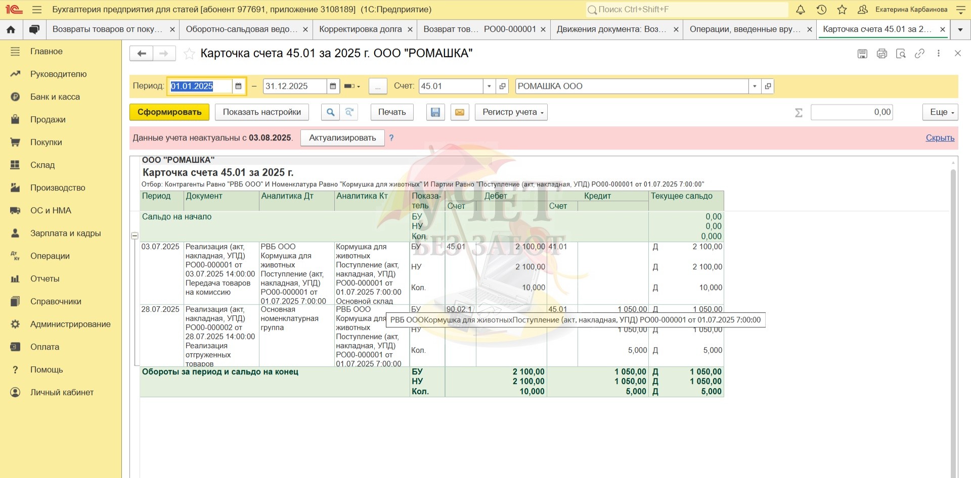 Таким образом, вы проведете полученный УПД от РВБ и остаток на 45 останется без изменений. Более того, возврат выкупленного товара и ручная операция не отразятся в движениях на 45 счете: