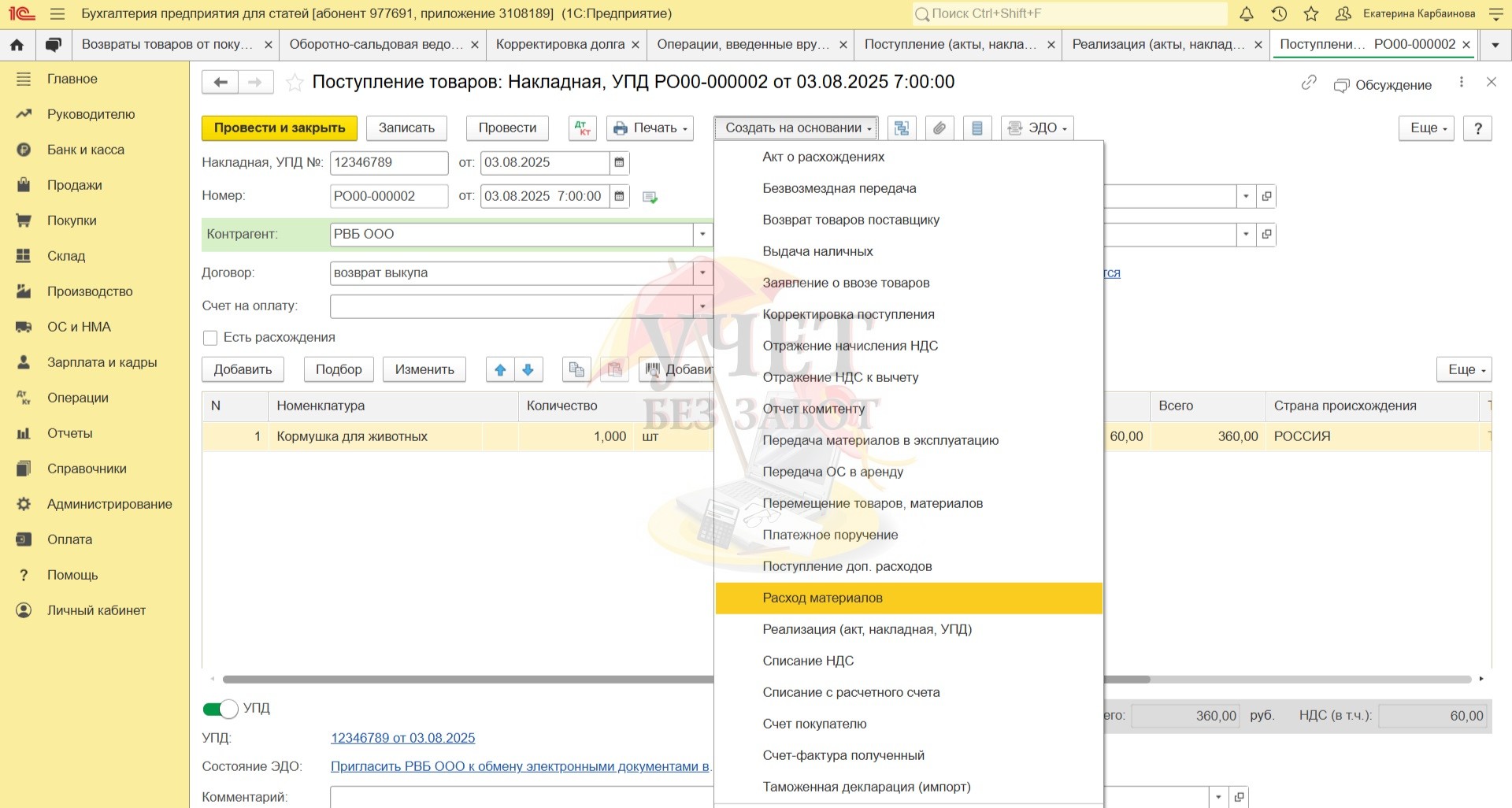 Вы можете также провести поступление товара по полученному УПД, но товар придется списать, т.к. фактически к вам на склад ничего не возвращается. Нажимаем «Создать на основании» и выбираем «Расход материалов»: