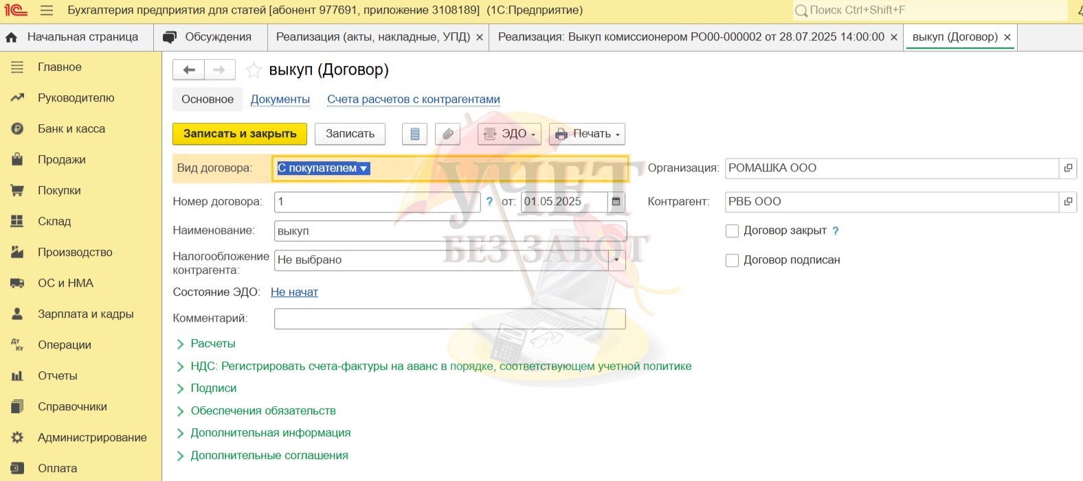 Автомат настроен таким образом, чтобы для тех, кто работает с НДС, УПД на выкуп выгружался со следующим основанием «Уведомление о выкупе ….от ….» . Указывать в основании уведомление, его номер и дату необходимо, чтобы РВБ идентифицировал документ и подписал его. Если вести учет на одном договоре, то придется редактировать документ в ЭДО. Но эта операция займет пару минут, а при работе с ОСВ и возвратами вы сэкономите гораздо больше времени.