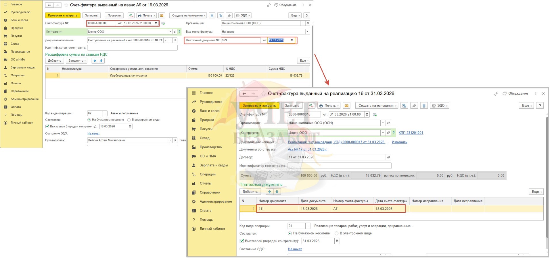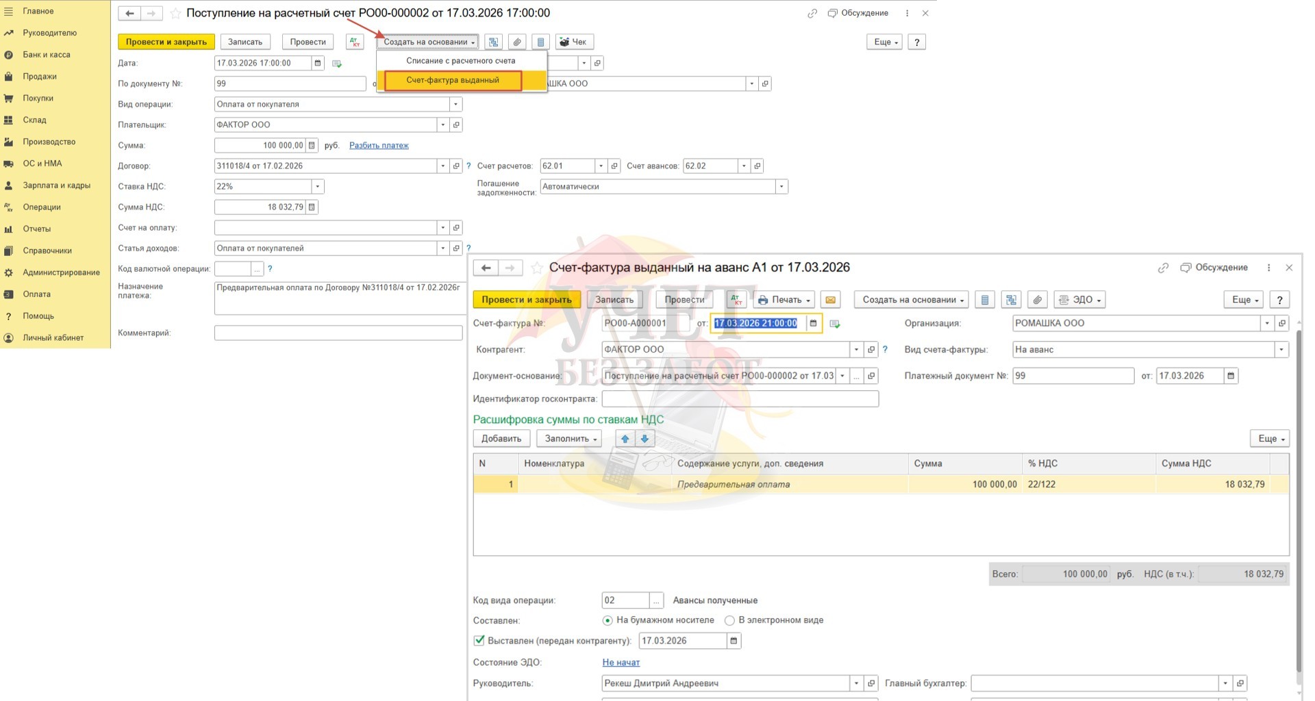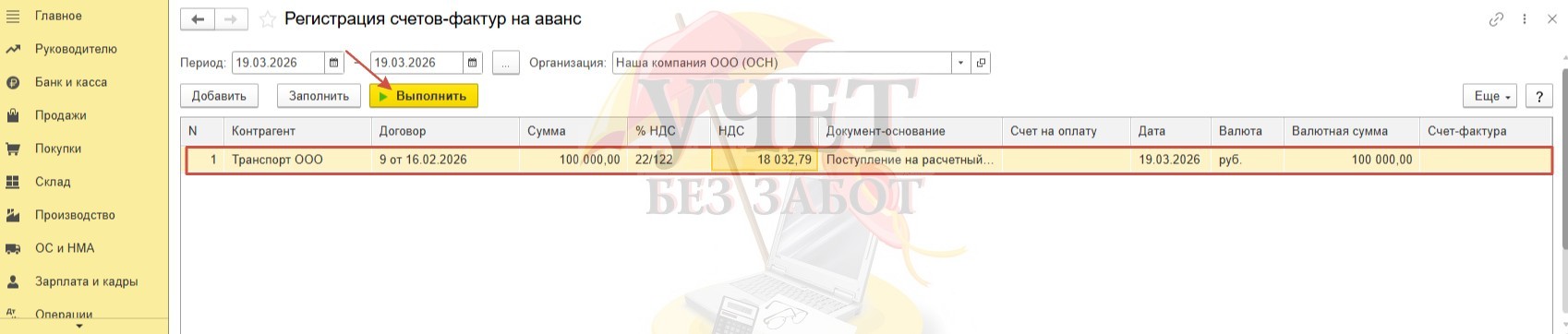 а затем задним числом поступление на расчетный счет и счет-фактура на аванс (даты документов 18.03.2026г).