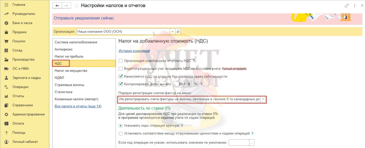 Программа будет регистрировать счет-фактуры на аванс автоматически, в соответствии с выбранными настройками (раздел меню «Главное» - «Налоги и отчеты», вкладка «НДС») в поле «Порядок регистрации счетов-фактур на аванс»).