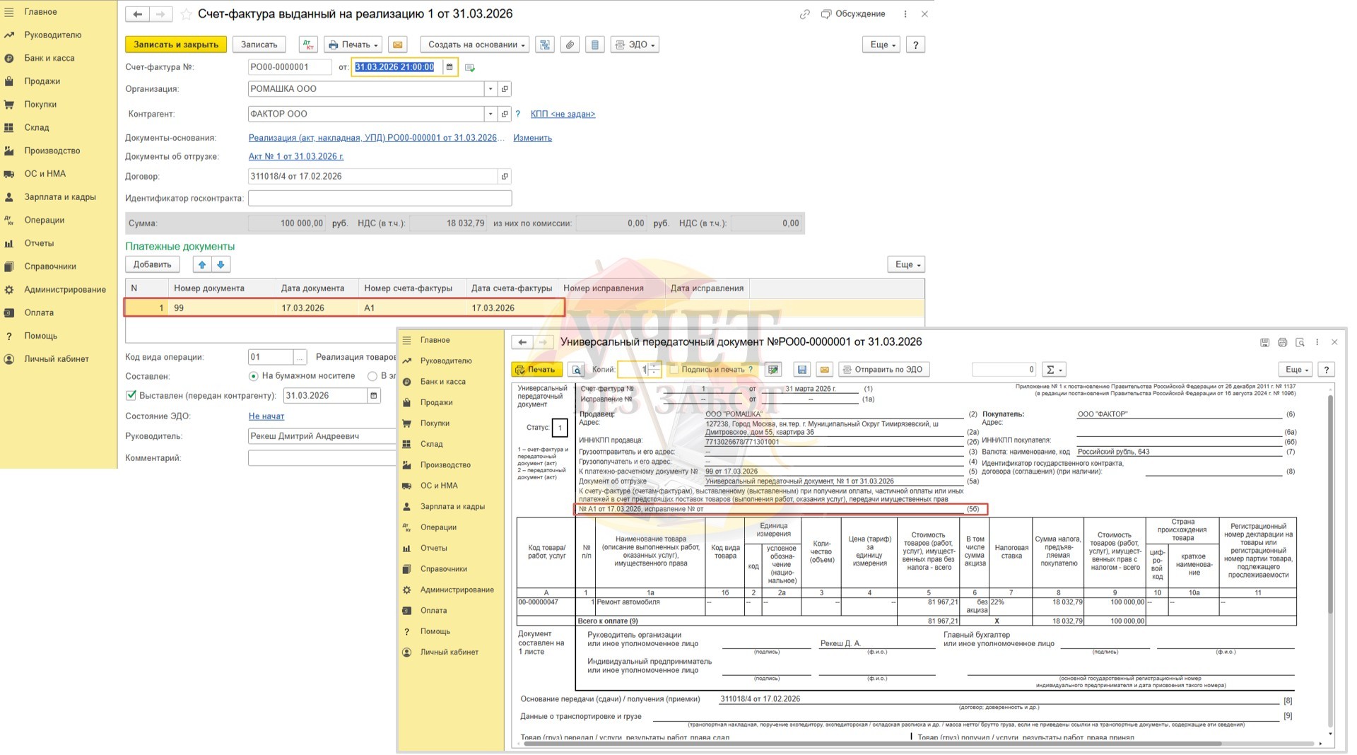Предположим, что 17.03.2026г на расчетный счет ООО «Ромашка» поступила предварительная оплата от покупателя в счет предстоящей поставки услуг в размере 100 000 руб. (в т.ч. НДС – 18 032,79).