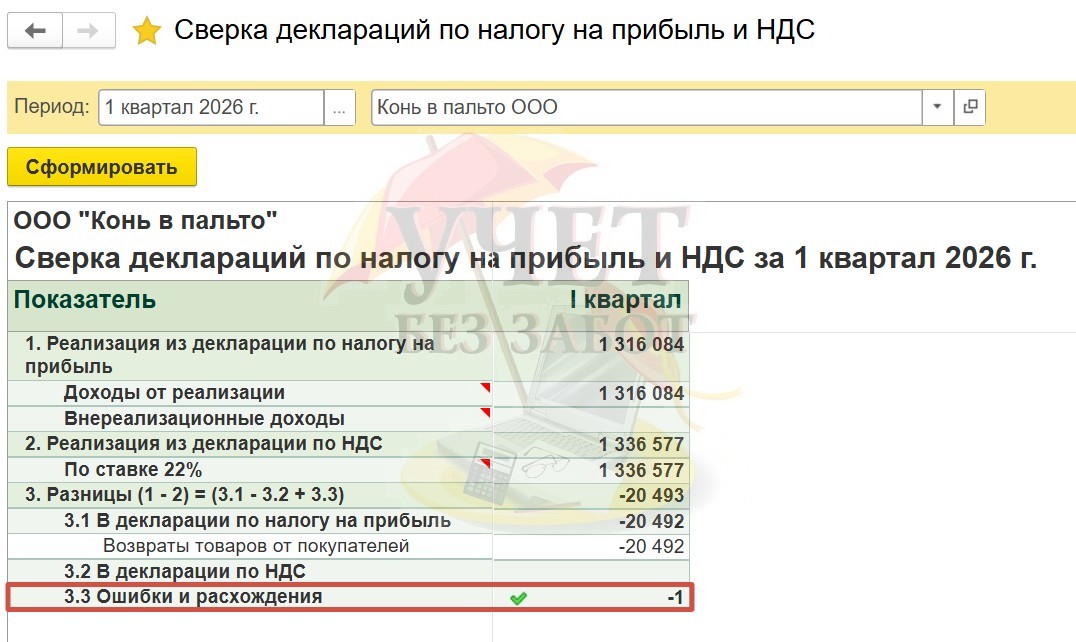 Главное, на что обязательно нужно обращать внимание в данном отчете – это подраздел 3.3, в котором программа сообщает нам есть ли ошибки. В нашем примере разницы есть, но ошибок нет. Мы видим зеленую галочку. Ошибок нет, так как все расхождения объяснимы и вызваны различиями в правилах отражения операций по разным налогам.