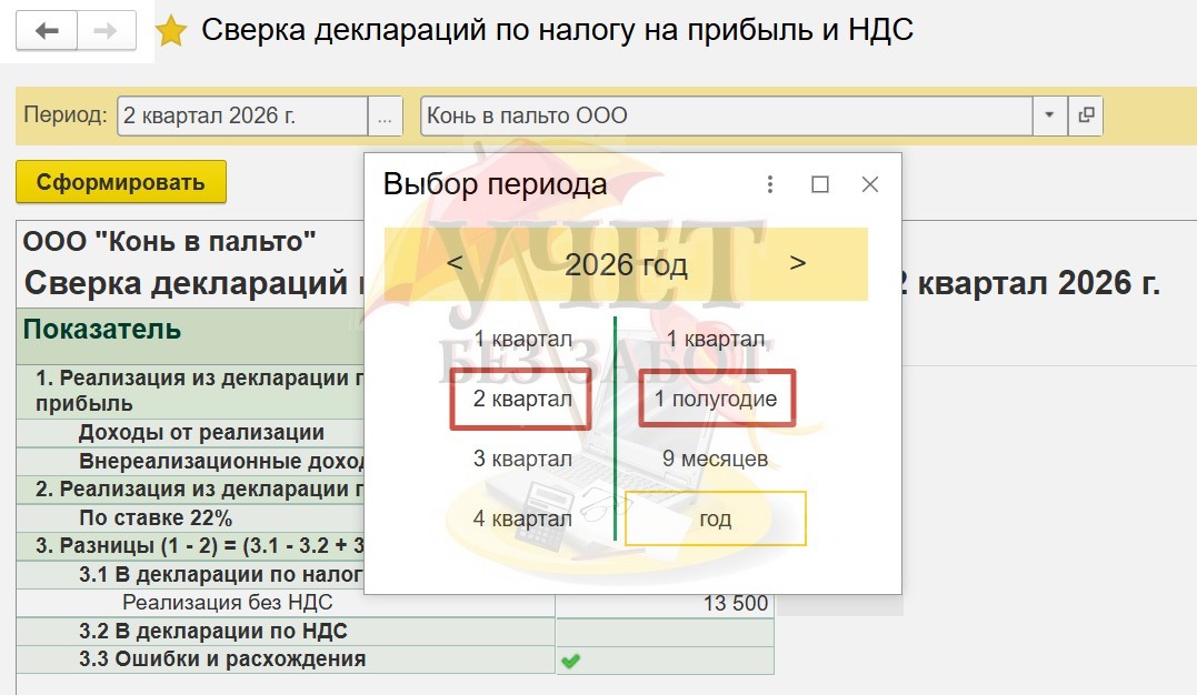 Обратите внимание, что мы можем провести сверку за 2 квартал или же за 1 полугодие.