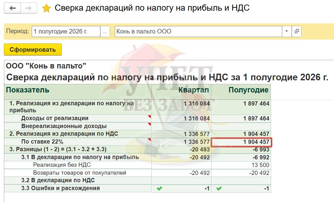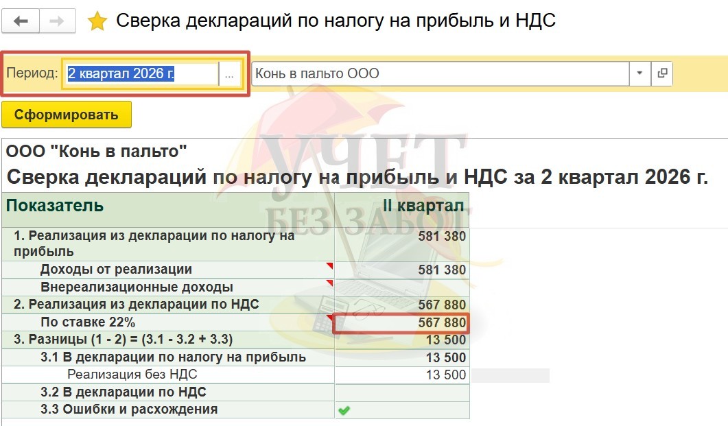 Мы видим, что в нашем примере появилась еще одна разница по данным во втором квартале, вызванная реализацией без НДС.