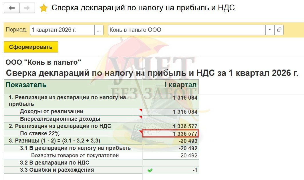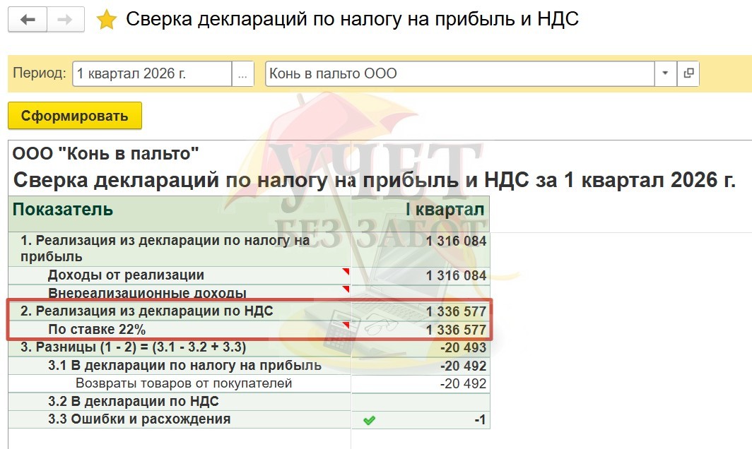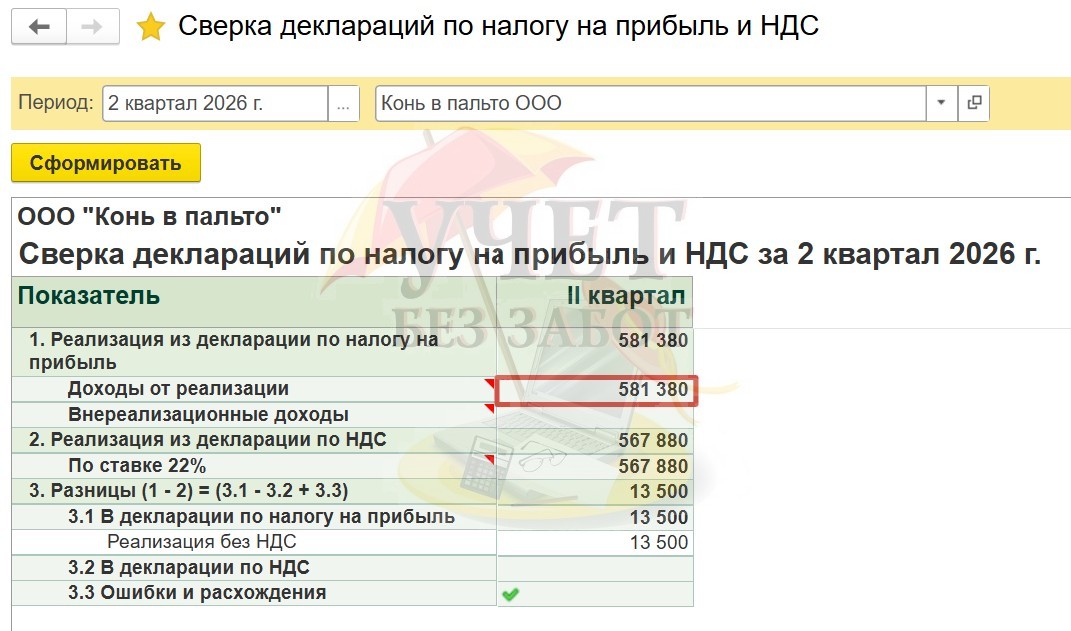 Данный отчет автоматически производит сверку выручки от реализации на основании заполненных деклараций по налогу на прибыль и НДС.