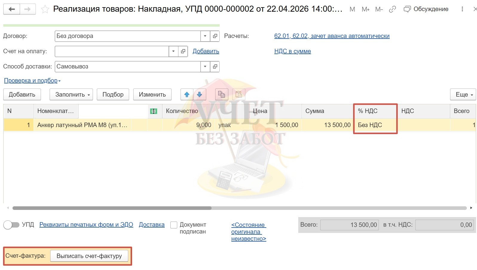 В нашем примере это ошибка. Не верно указана ставка налога и не выписан счет-фактура.