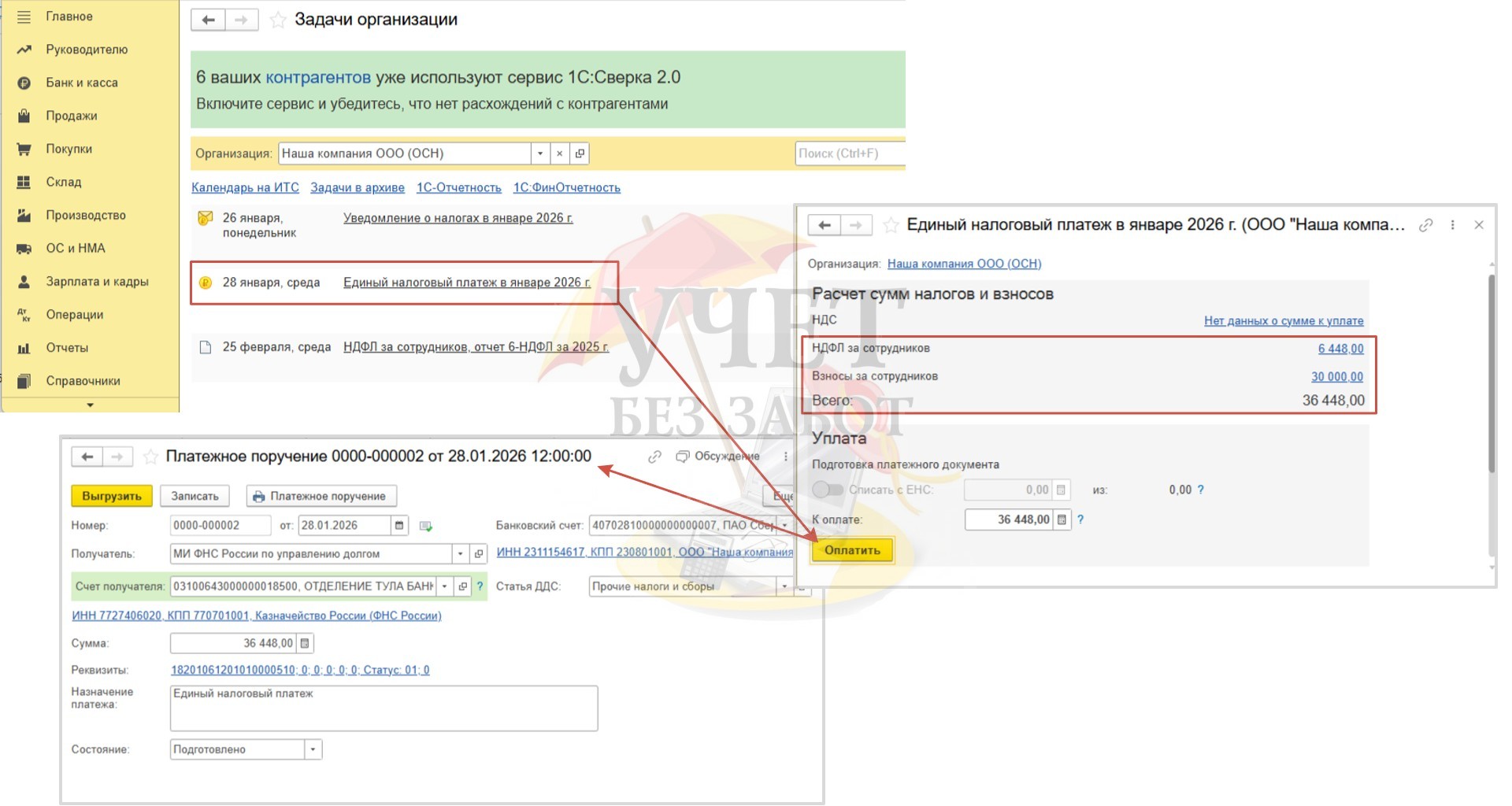 Следующее по хронологии - напоминание об уплате налогов – 28.01.26. При этом программа учитывает, что нужно уплатить НДФЛ и страховые взносы по единому тарифу. После того как мы убедились в корректности сумм, нажимаем «Оплатить» для создания платежного поручения.