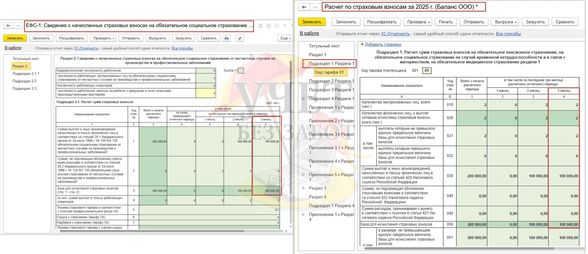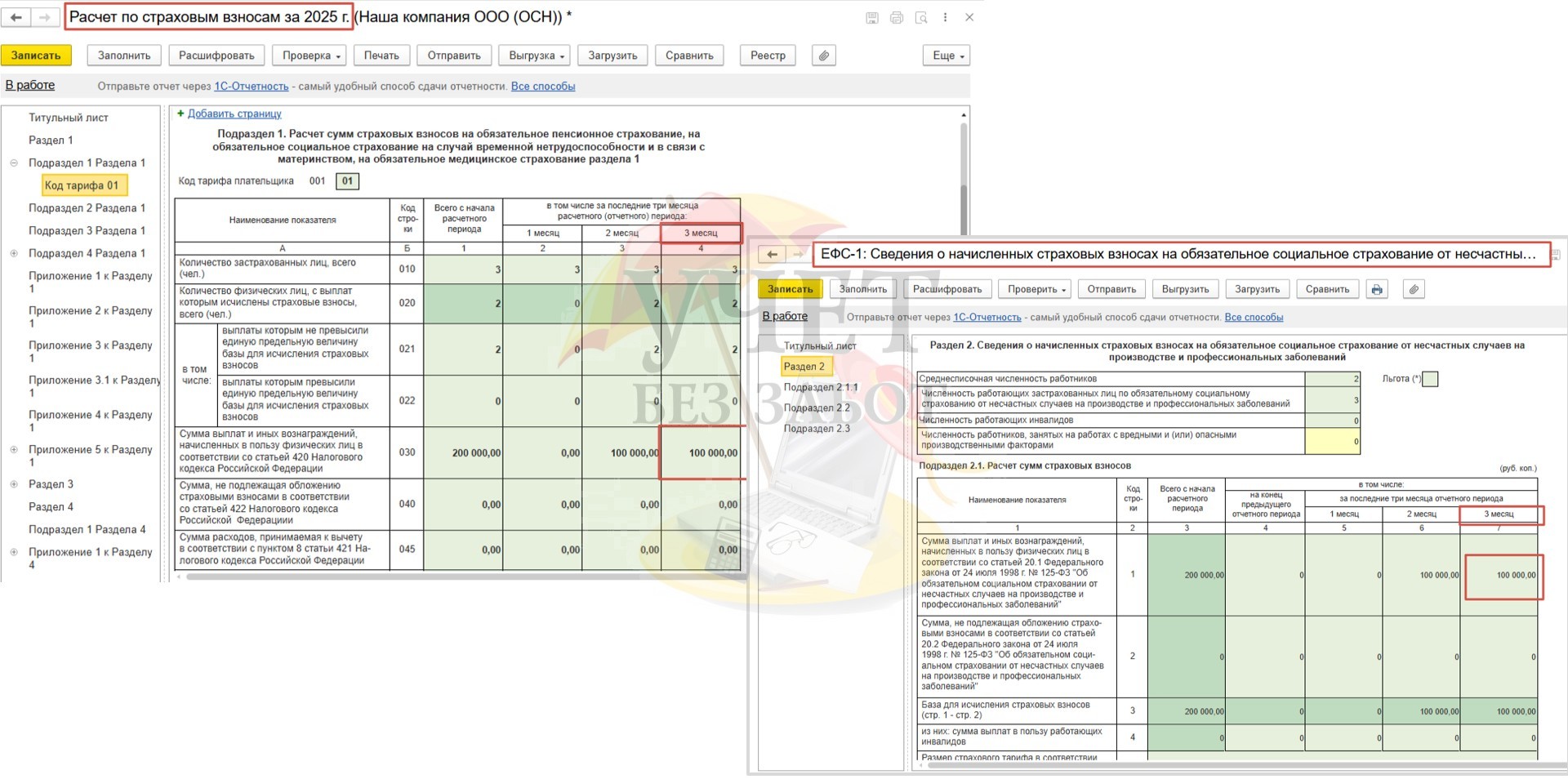 Отчеты Расчет по страховым взносам и ЕФС-1 Раздел 2 за 2025 год заполняются в обычном порядке с учетом декабрьской заработной платы.