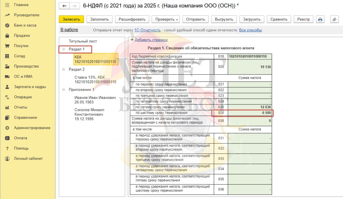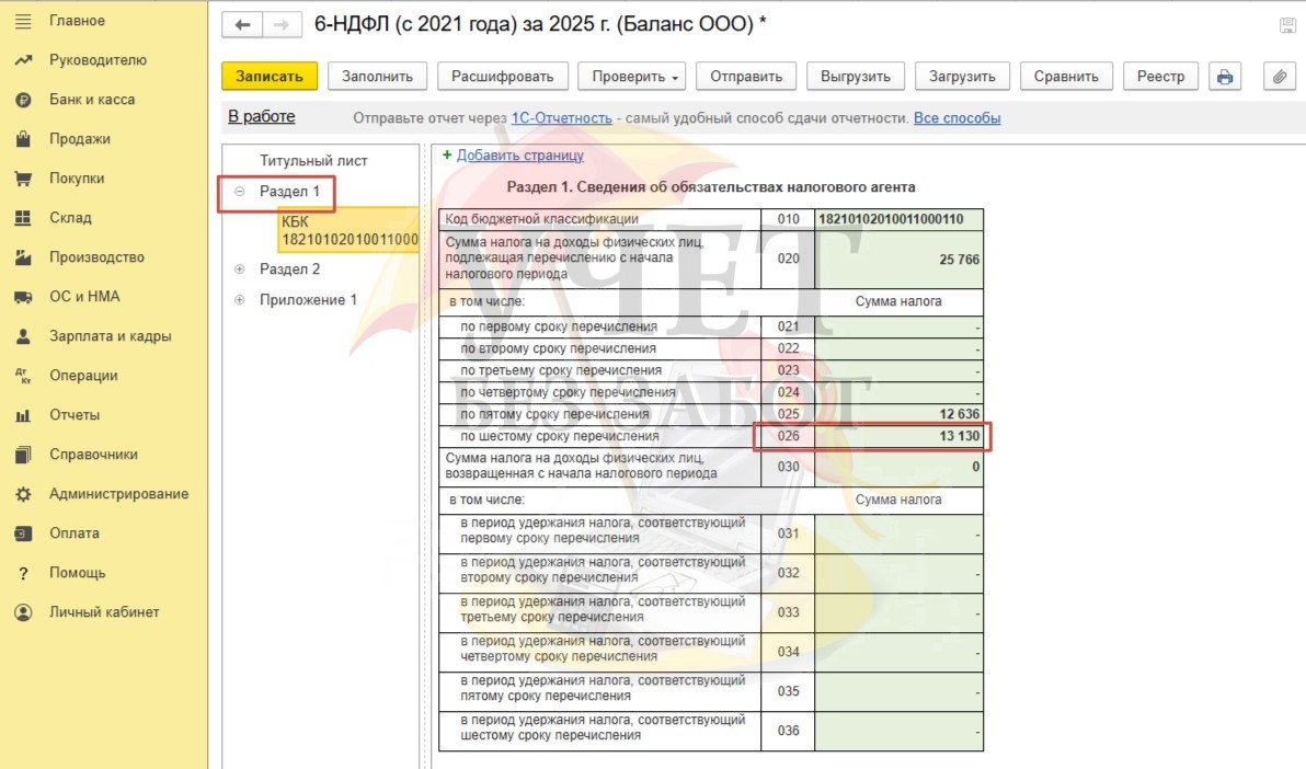 Теперь сформируем 6-НДФЛ. При выплате окончательного расчета по декабрьской зарплате в январе в отчете за 2025 год будут отражены суммы дохода и исчисленного НДФЛ только по авансу. То есть отражаем только те доходы, которые и начислены, и выплачены. И несмотря на то, что начисление декабрьской зарплаты зарегистрировано в программе 30.12.25, в отчете за 2025 год эти данные не попадут, т.к выплата дохода произойдет уже в 2026 г., а отчет 6-НДФЛ, как мы помним, формируется в момент выплаты дохода.