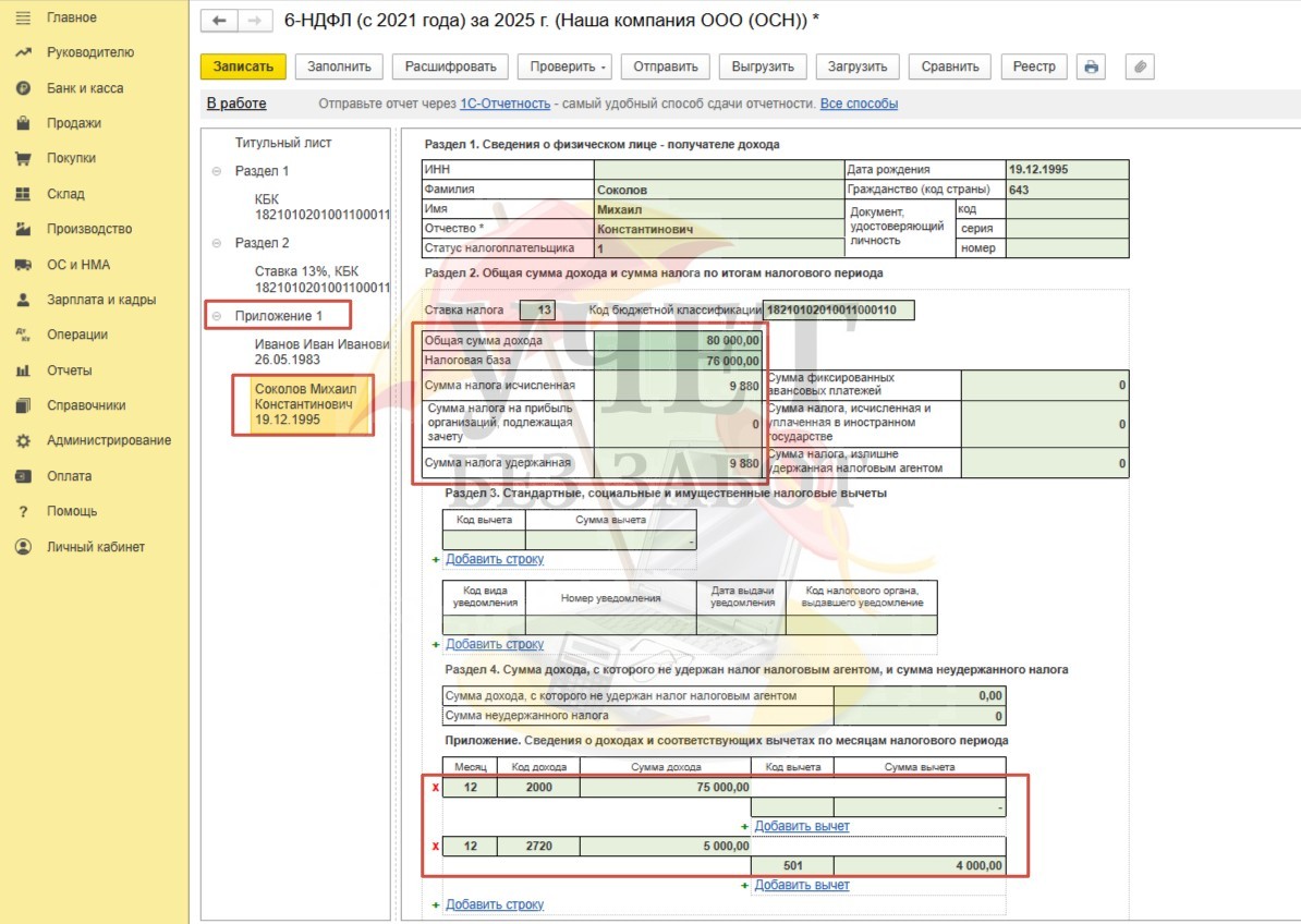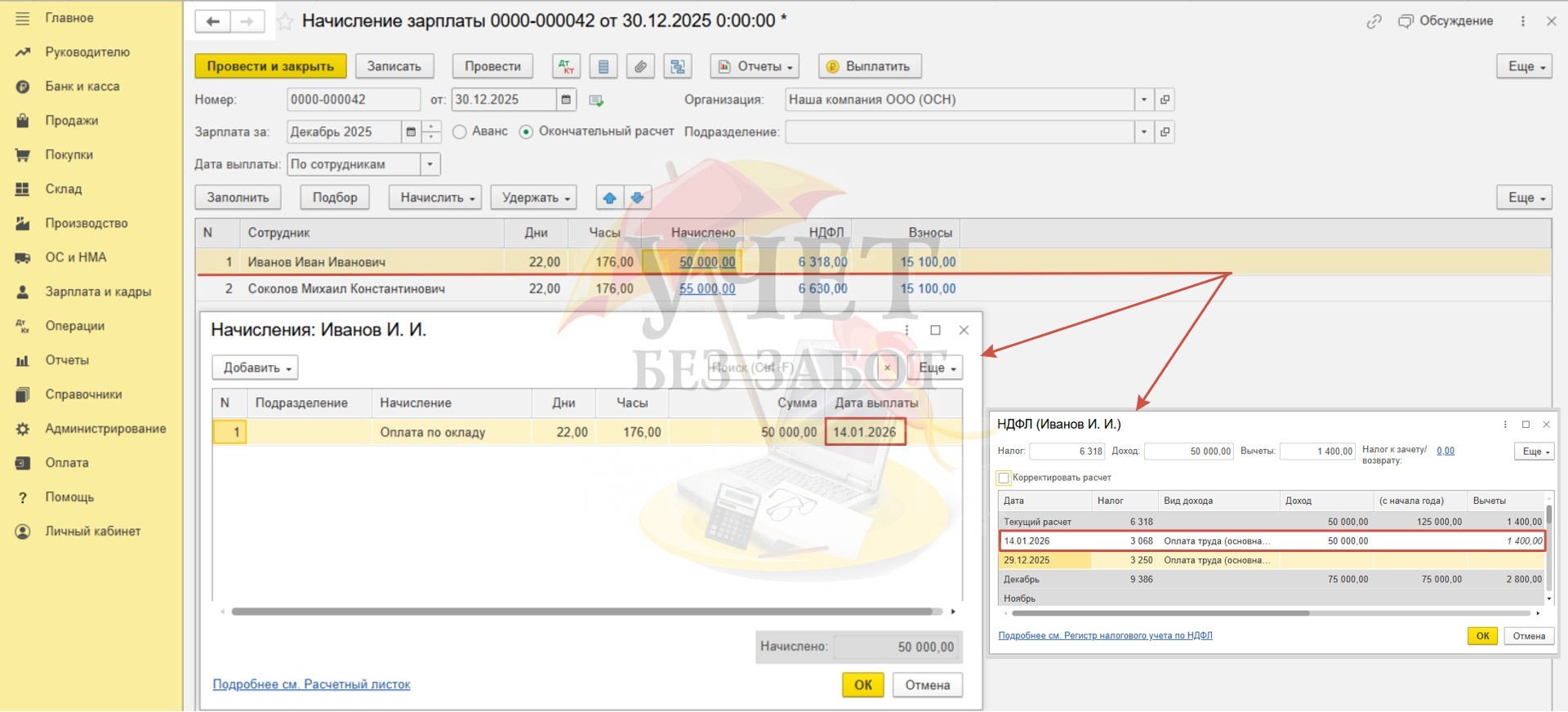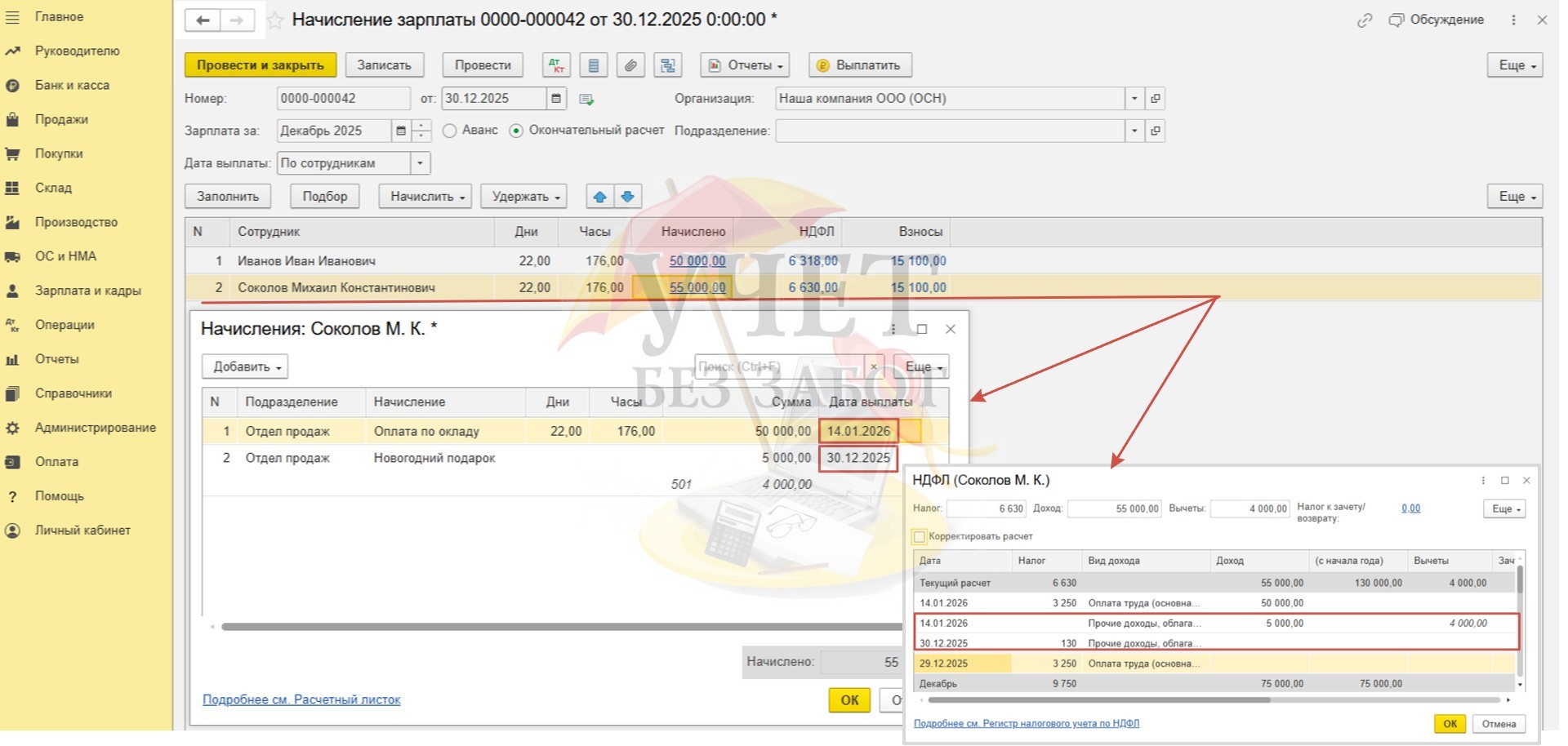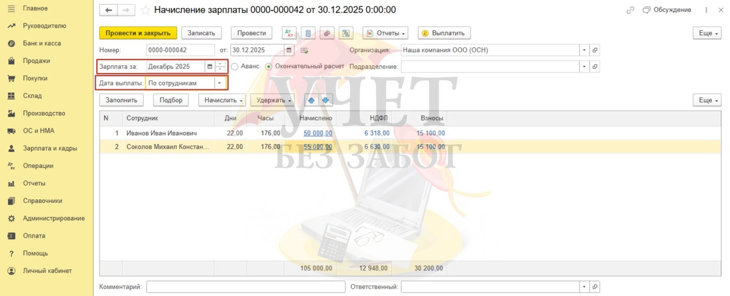 Условия примера: В ООО «Наша компания» установлены сроки выплаты декабрьской заработной платы: расчет за первую половину месяца – 29.12.2025г, окончательный расчет – 14.01.2026г. Для сотрудника Иванова И.И. в программе зарегистрировано заявление на предоставление детского вычета в размере 1 400 руб. (сумма дохода за весь 2025 год не превышает лимит в размере 450 000 руб.). Для сотрудника Соколова М.К. в программе зарегистрирован доход в виде стоимости новогоднего подарка в размере 5 000 руб. (дата выдачи подарка 30.12.25г, дата удержания НДФЛ – 14.01.2026г).