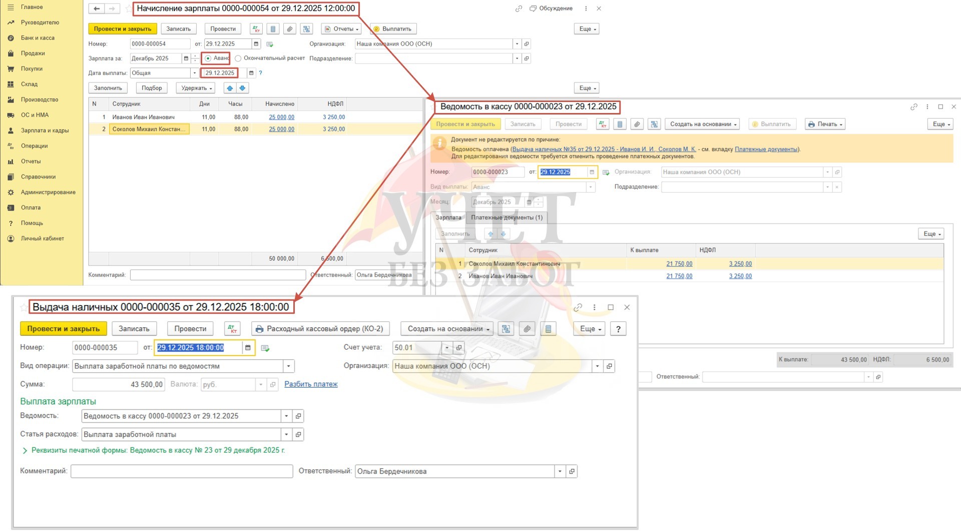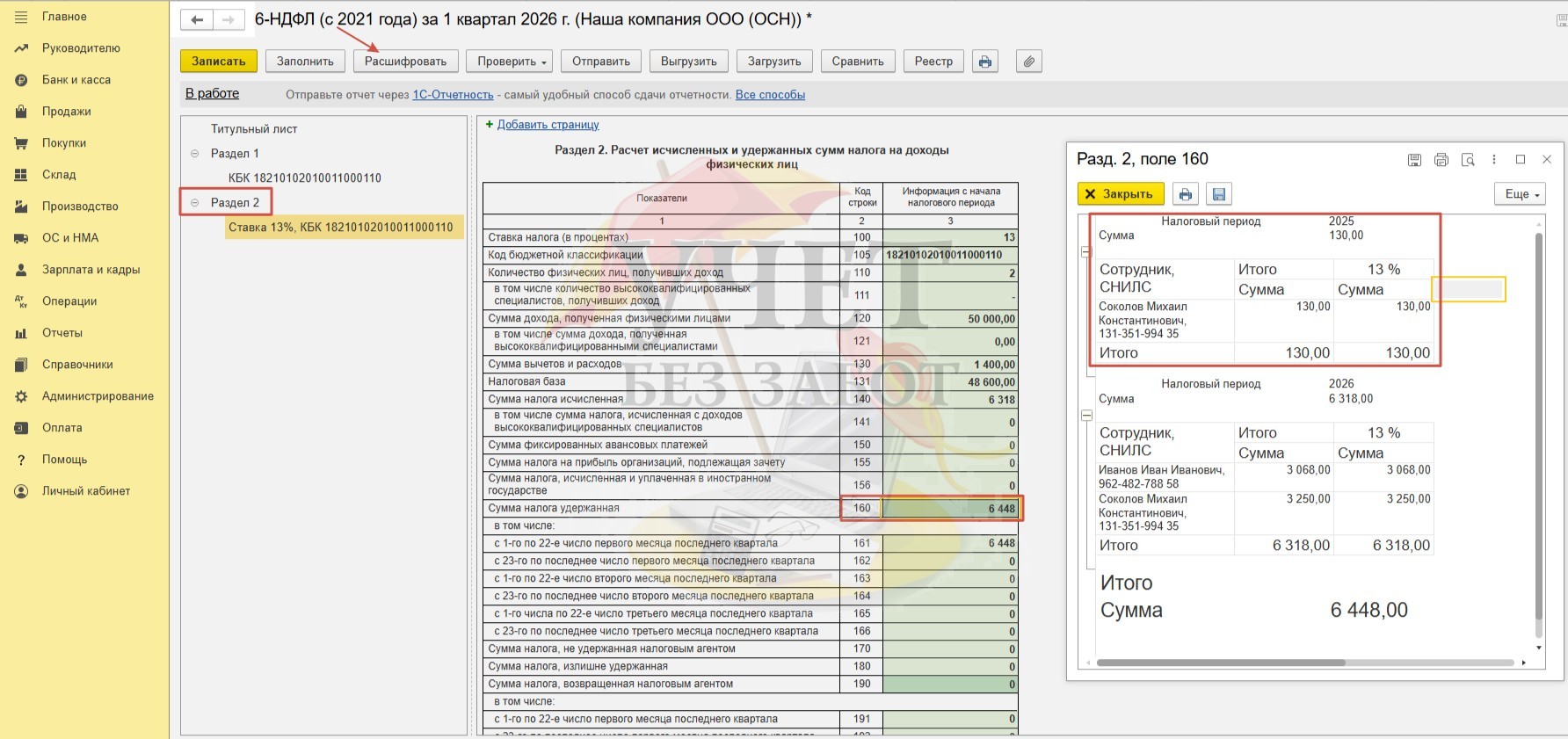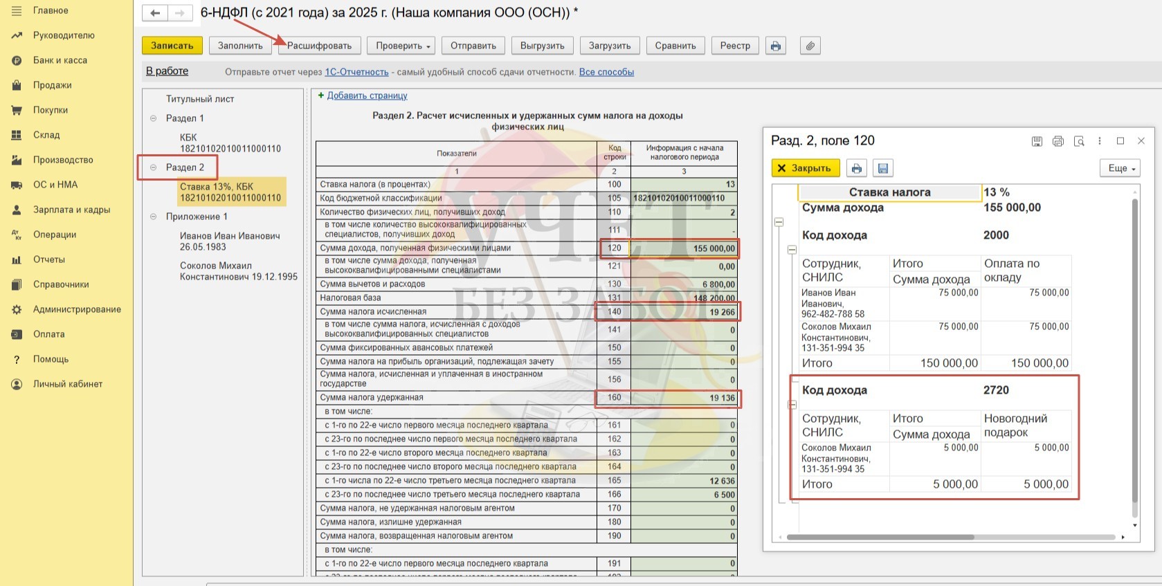 Условия примера: В ООО «Наша компания» установлены сроки выплаты декабрьской заработной платы: расчет за первую половину месяца – 29.12.2025г, окончательный расчет – 14.01.2026г. Для сотрудника Иванова И.И. в программе зарегистрировано заявление на предоставление детского вычета в размере 1 400 руб. (сумма дохода за весь 2025 год не превышает лимит в размере 450 000 руб.). Для сотрудника Соколова М.К. в программе зарегистрирован доход в виде стоимости новогоднего подарка в размере 5 000 руб. (дата выдачи подарка 30.12.25г, дата удержания НДФЛ – 14.01.2026г).