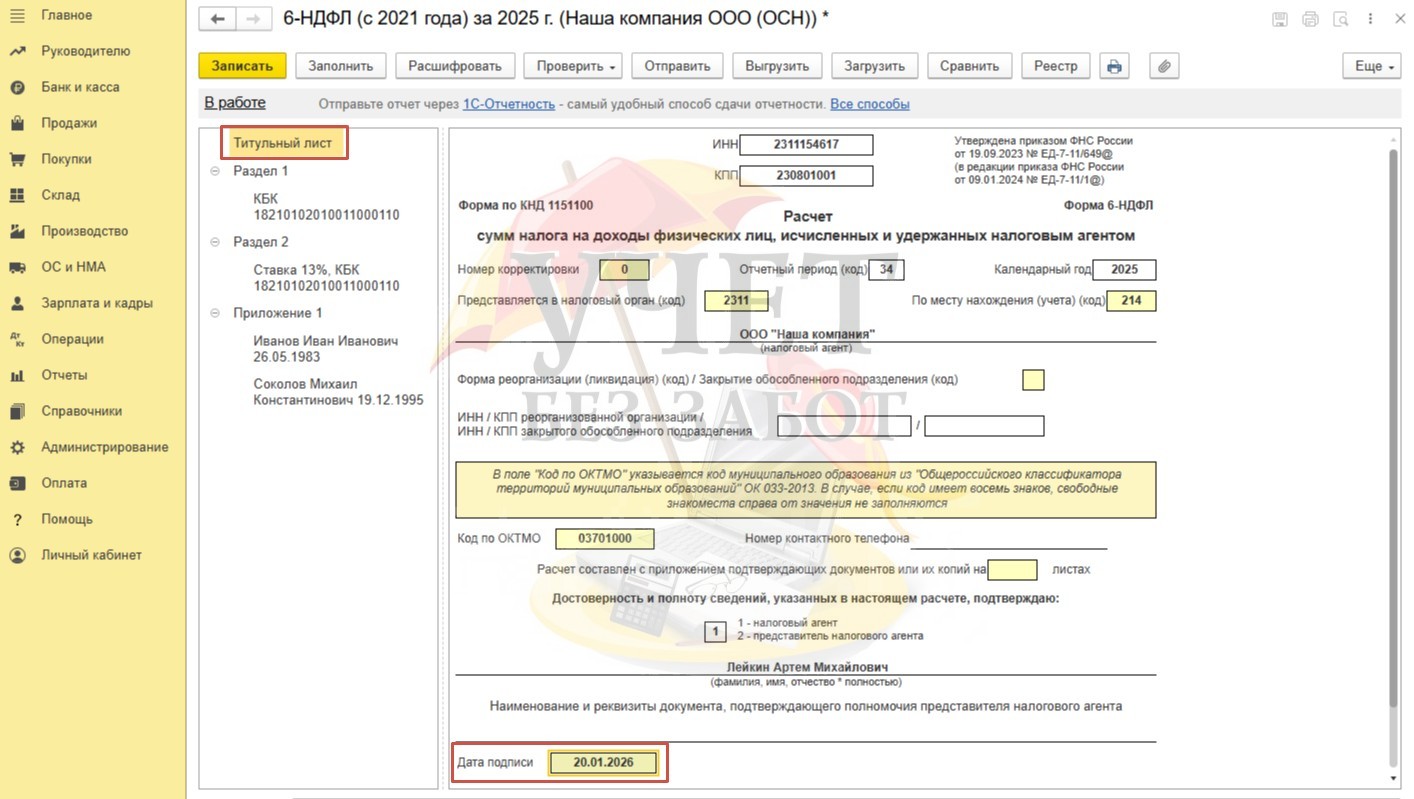 Важно! Для корректного заполнения отчета за 2025 год дата формирования на титульном листе должна быть больше, чем дата выплаты в январе. В противном случае есть вероятность неправильного заполнения строк в части удержанного/ не удержанного налога.