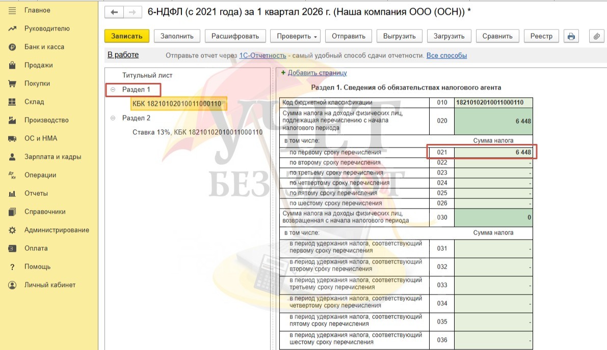 Налог, удержанный с окончательного расчета и с натурального дохода в виде стоимости подарка отражается по строке 021 Раздела 1 в отчете за 1 квартал 2026г.