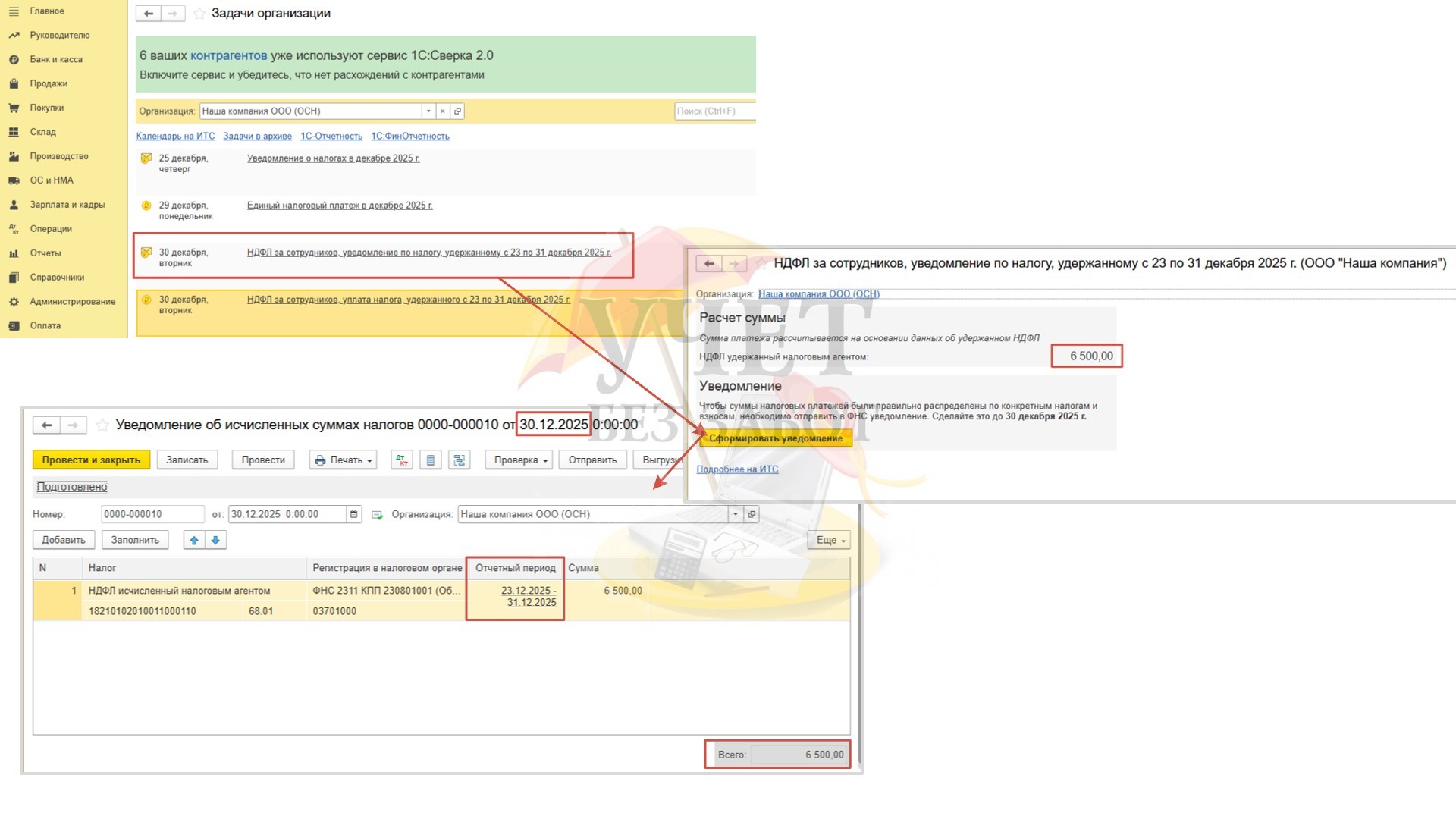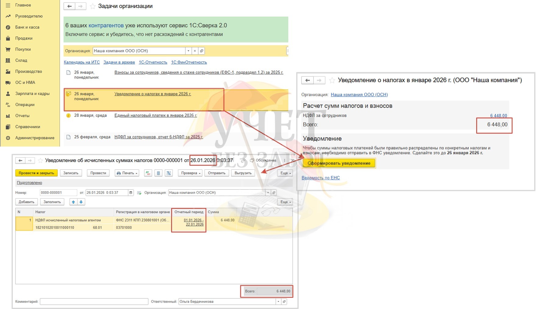 Далее программа напоминает об обязанности представить уведомление по налогам (перенос с 25.01.26). Перейдём по этой ссылке. Сумма НДФЛ корректна. Воспользуемся командой «Сформировать уведомление». Программа автоматически заполнит документ. Уведомление готово к отправке.