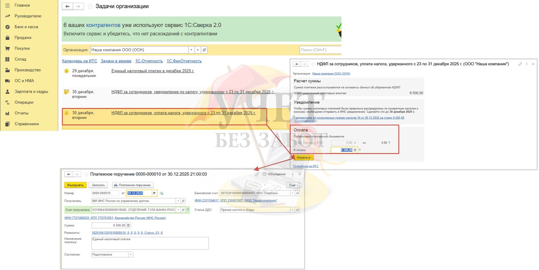 Кроме этого, есть напоминание об уплате НДФЛ, также в срок 30.12.2025. Перейдя по ссылке в пункте «Задачи организации» и воспользовавшись командой «Оплатить», можно сразу создать платежное поручение.