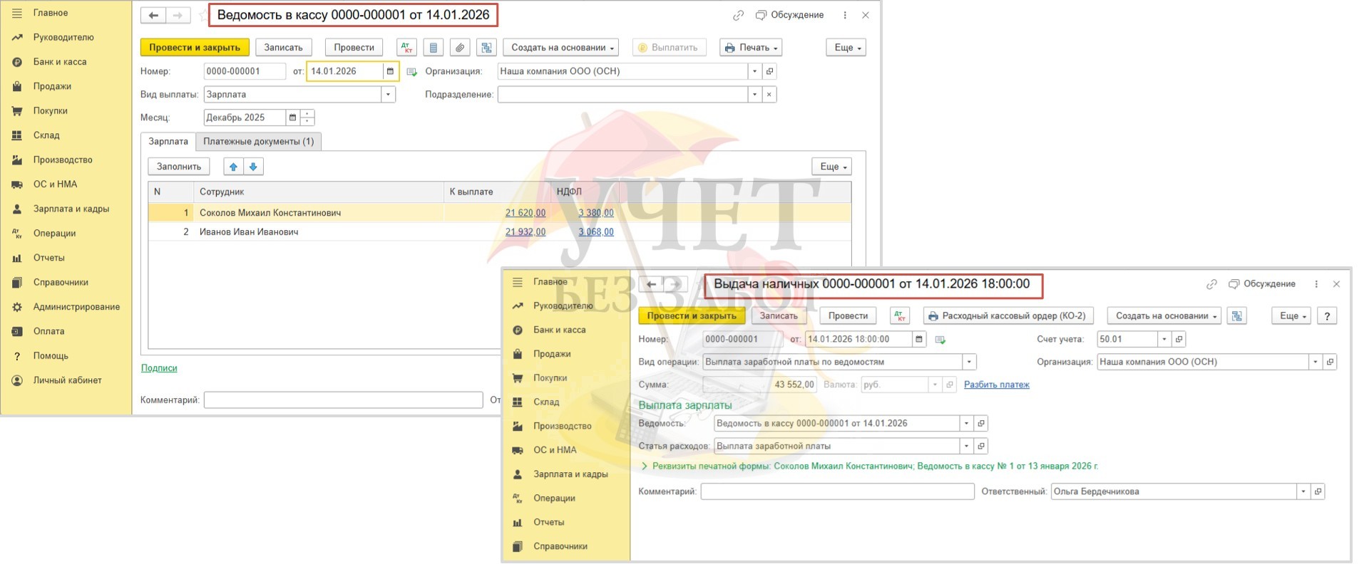 14.01.2026 г. зарегистрируем в программе документы – «Ведомость в кассу» в разделе меню «Зарплата и кадры» - «Ведомости в кассу» и «Выдача наличных» в разделе «Банк и касса» - «Кассовые документы».
