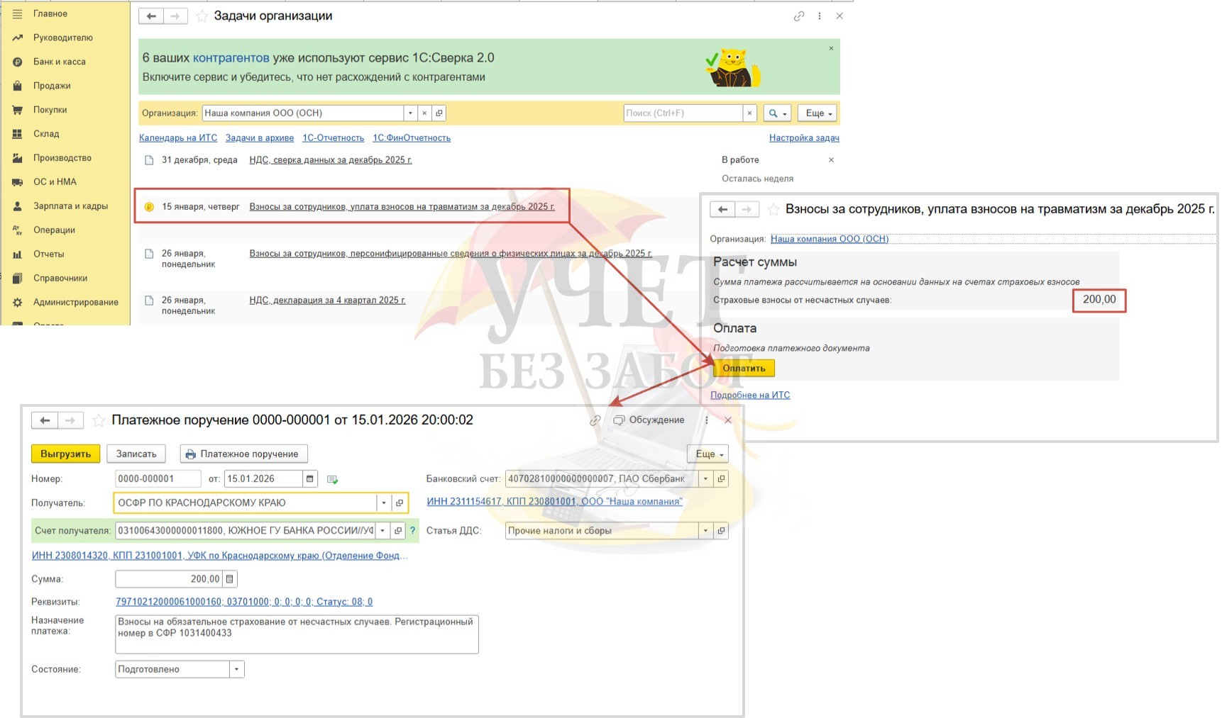Перейдем в раздел меню «Главное» - «Задачи организации». В ходе реализации нашего практического примера первым наступает срок уплаты взносов на травматизм – 15.01.26. Перейдя по ссылке с напоминанием об уплате, программа предоставляет возможность сразу же сверить сумму исчисленных взносов и сформировать платежное поручение для дальнейшей выгрузки.