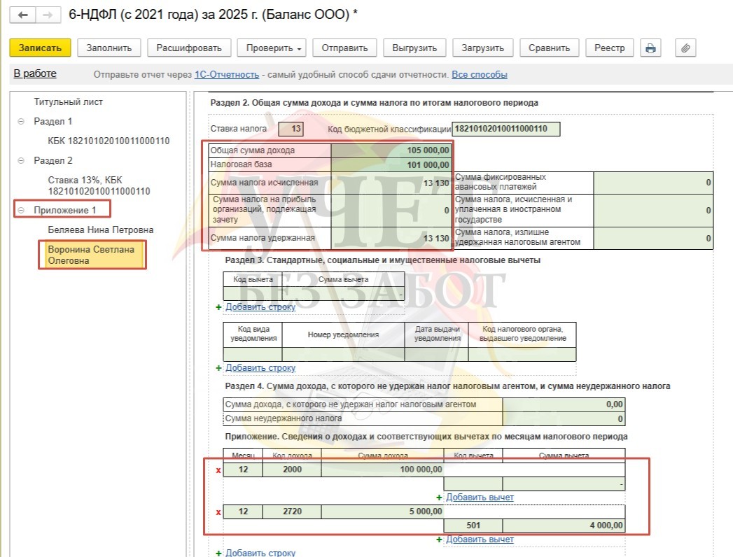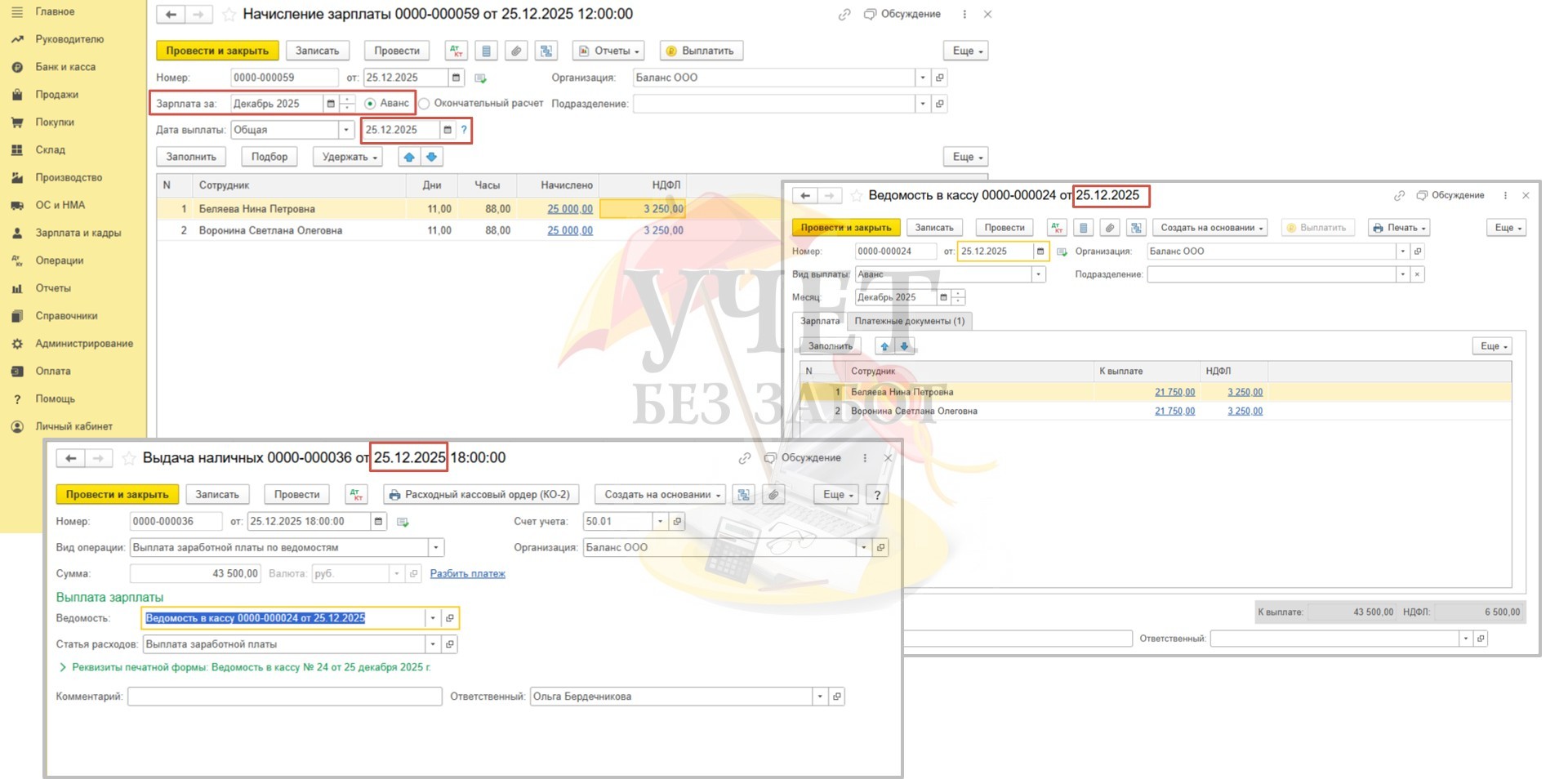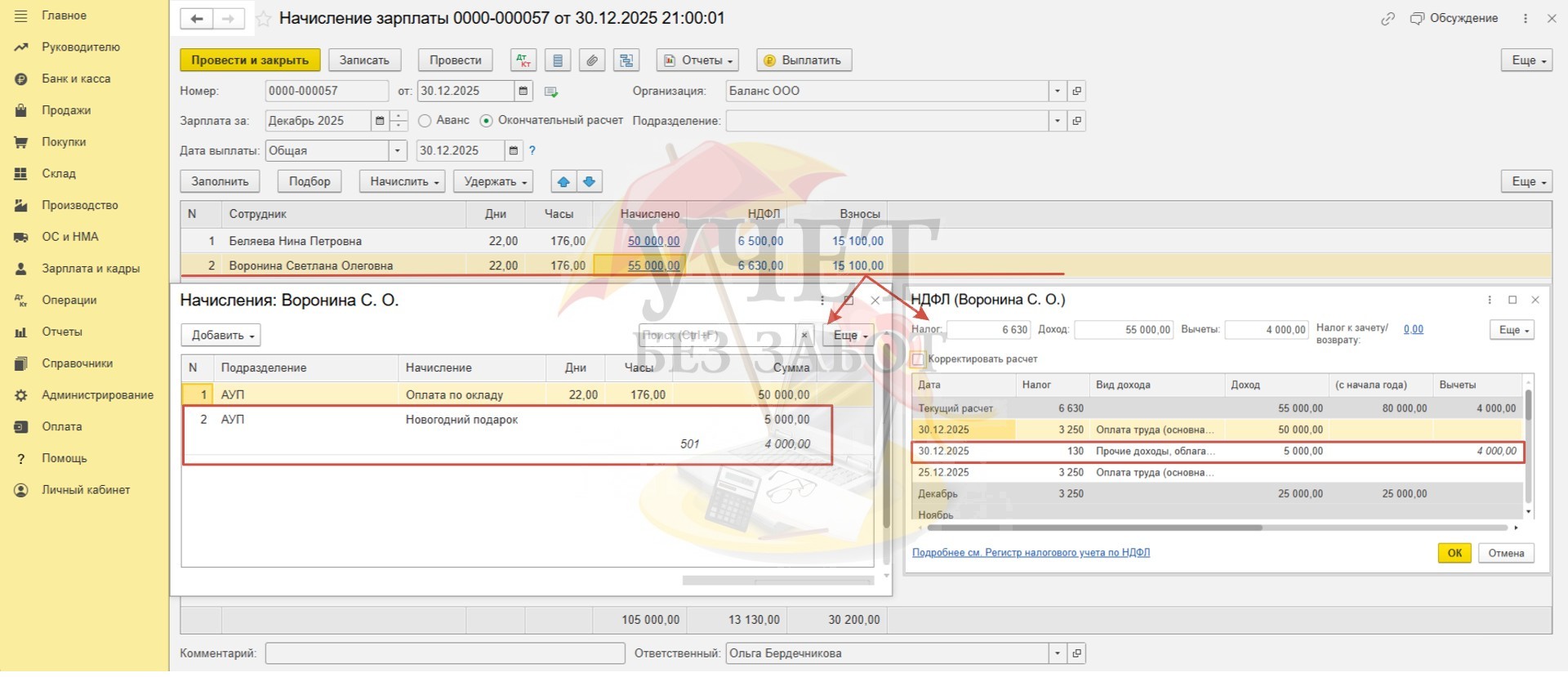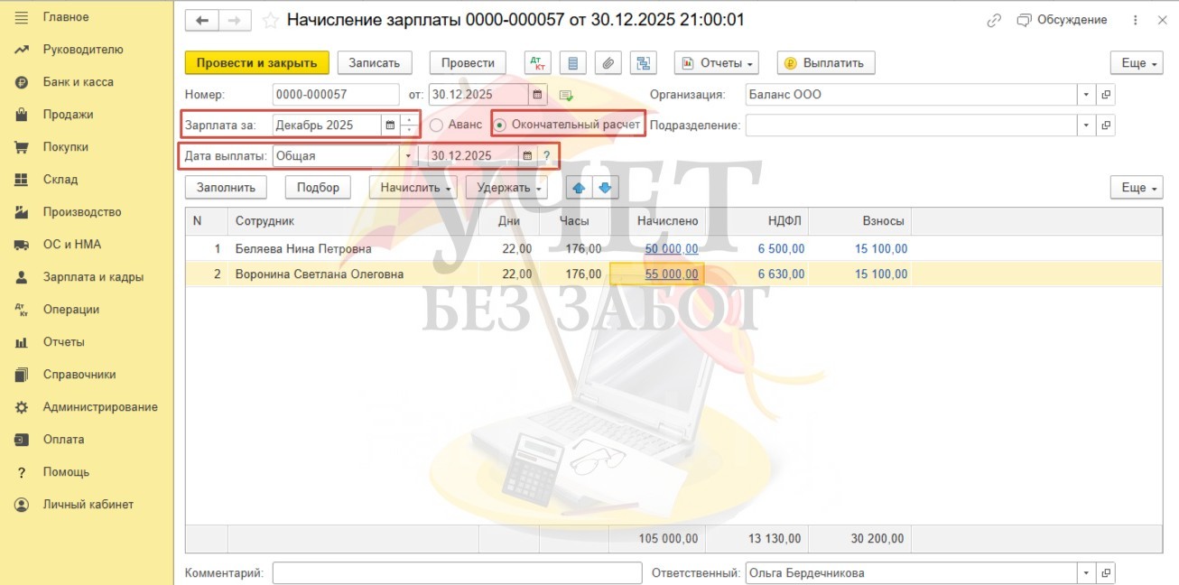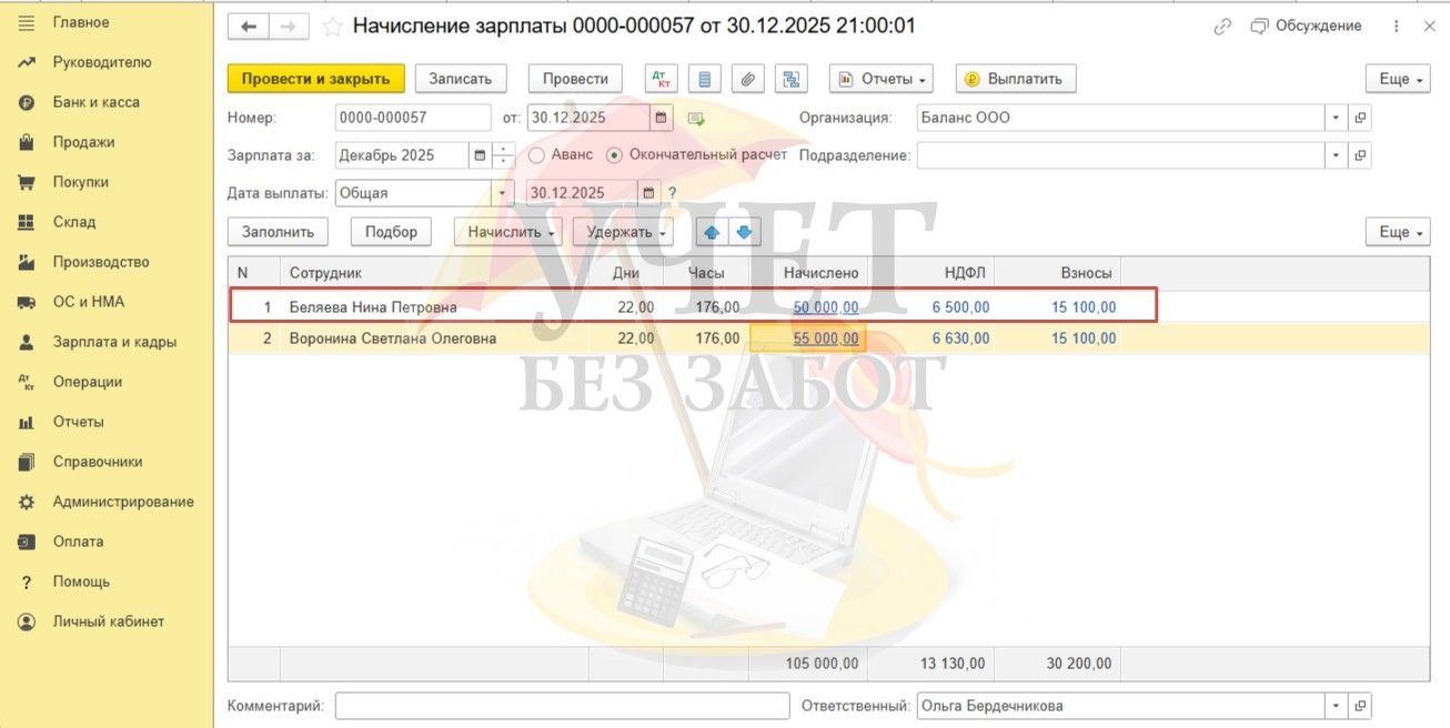 Условия примера: в ООО «Баланс» установлены сроки выплаты декабрьской заработной платы: расчет за первую половину месяца – 25.12.2025г, окончательный расчет в связи с переносом из-за праздничных и выходных дней - 30.12.2025г. Для сотрудницы Беляевой Н.П. в программе зарегистрировано заявление на предоставление детского вычета в размере 1 400 руб. (сумма дохода за весь 2025 год не превышает лимит в размере 450 000 руб.). Для сотрудницы Ворониной С.О. в программе зарегистрирован доход в виде стоимости новогоднего подарка в размере 5 000 руб. (дата выдачи подарка и удержания НДФЛ - 30.12.25г).
