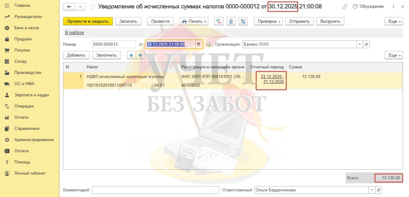 Перейдем в раздел меню «Операции» - «Уведомления». Создадим новый документ. Воспользуемся кнопкой «Заполнить». После этого в документ будет добавлена информация о сумме удержанного НДФЛ за период с 23.12.25 по 31.12.25. Срок представления уведомления и уплаты удержанного НДФЛ по декабрьской зарплате – 30.12.25г.