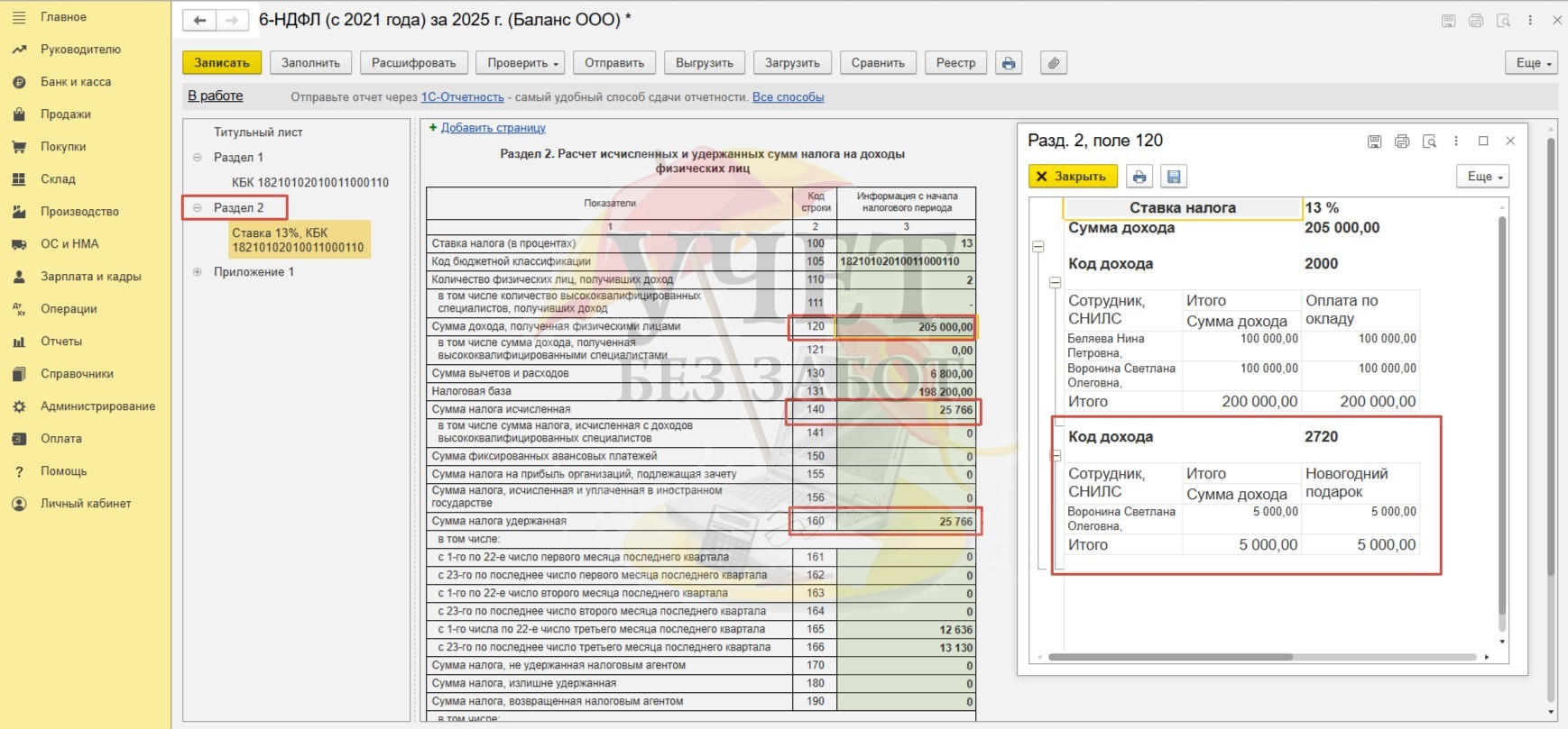 Обращаем внимание на особенности заполнения отчета при выдаче подарков, где принцип отражения доходов будет отличаться. Если презент выдается в декабре, а удержание налога происходит при денежной выплате января (как в нашем примере), то сумма дохода в размере стоимости подарка будет отражена по строке 120 Раздела 2, а налог, исчисленный с данной суммы – по строке 140 Раздела 2. При этом удержанный налог в отчете за 2025 год по Разделу 2 не отражается,
